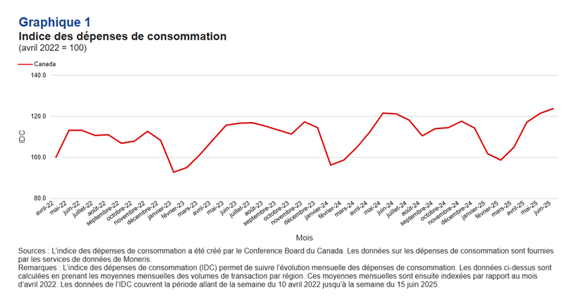 Dans le cadre de notre partenariat avec le Conference Board du Canada, nous avons le plaisir de présenter le commentaire fiable suivant de son indice des dépenses de consommation (IDC) qui est alimenté par les services de données de MonerisMD. Nos données de pointe sur les dépenses de consommation qui proviennent des activités aux points de vente et qui sont obtenues grâce à l’expertise du Conference Board du Canada fournissent une perspective canadienne sur les tendances économiques, d’un océan à l’autre.