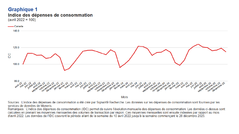 - L’indice des dépenses de consommation (IDC) de Signal49 Recherche a atteint en moyenne 116,9 points au quatrième trimestre de 2025 (avril 2022 = 100). D’un trimestre à l’autre, l’IDC a reculé par rapport à la moyenne de 118,8 points enregistrée au troisième trimestre, ce qui représente une baisse de 1,9 point ou de 1,6 %. Les résultats indiquent un léger ralentissement des dépenses à l’approche de la fin de l’année.