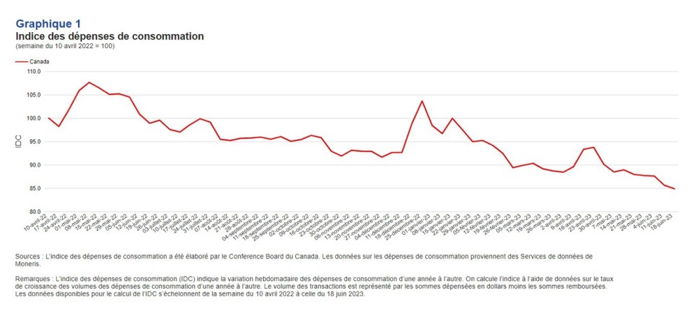 • La croissance des dépenses de consommation a ralenti durant deux mois consécutifs au deuxième trimestre 2023. L’indice des dépenses de consommation (IDC) s’est établi en moyenne à 91,3 points en avril, à 88,9 points en mai et à 86,5 points en juin.