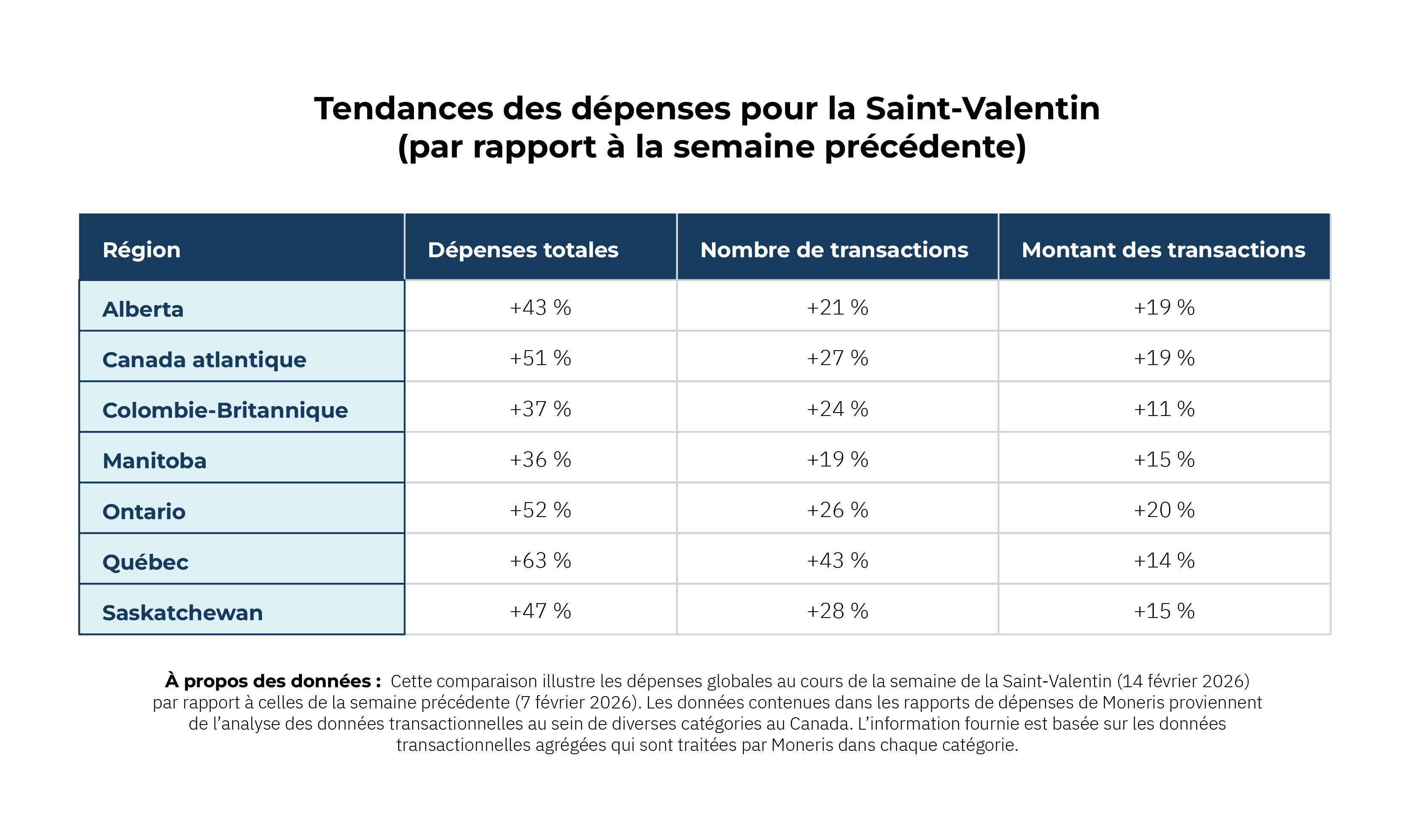 Bien que cette fête demeure importante pour les propriétaires de commerce au Canada, les dépenses ont été plus modérées en 2026 qu’en 2025. À l’échelle nationale, les dépenses liées à la Saint-Valentin ont été légèrement inférieures à celles de l’année dernière. Cependant, plusieurs provinces ont enregistré d’excellents résultats dans certaines catégories, ce qui montre à quel point le comportement régional continue d’avoir une incidence sur les retombées économiques de cette fête.